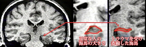 このトラウマを受けた脳画像は、脳全体において萎縮(神経細胞の崩壊)が見られます。